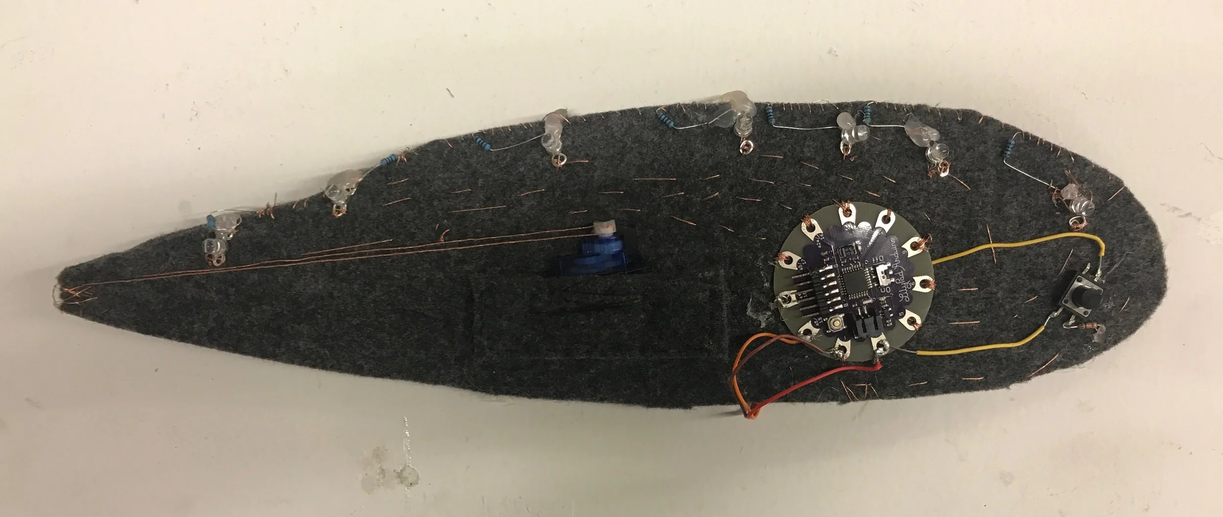 Writing the code using C++ I created a number of different light shows that change with the click of a button. Incorporating a servo motor into the thick felt body, I connected it to the tail allowing the final setting to include a moving tail feature.