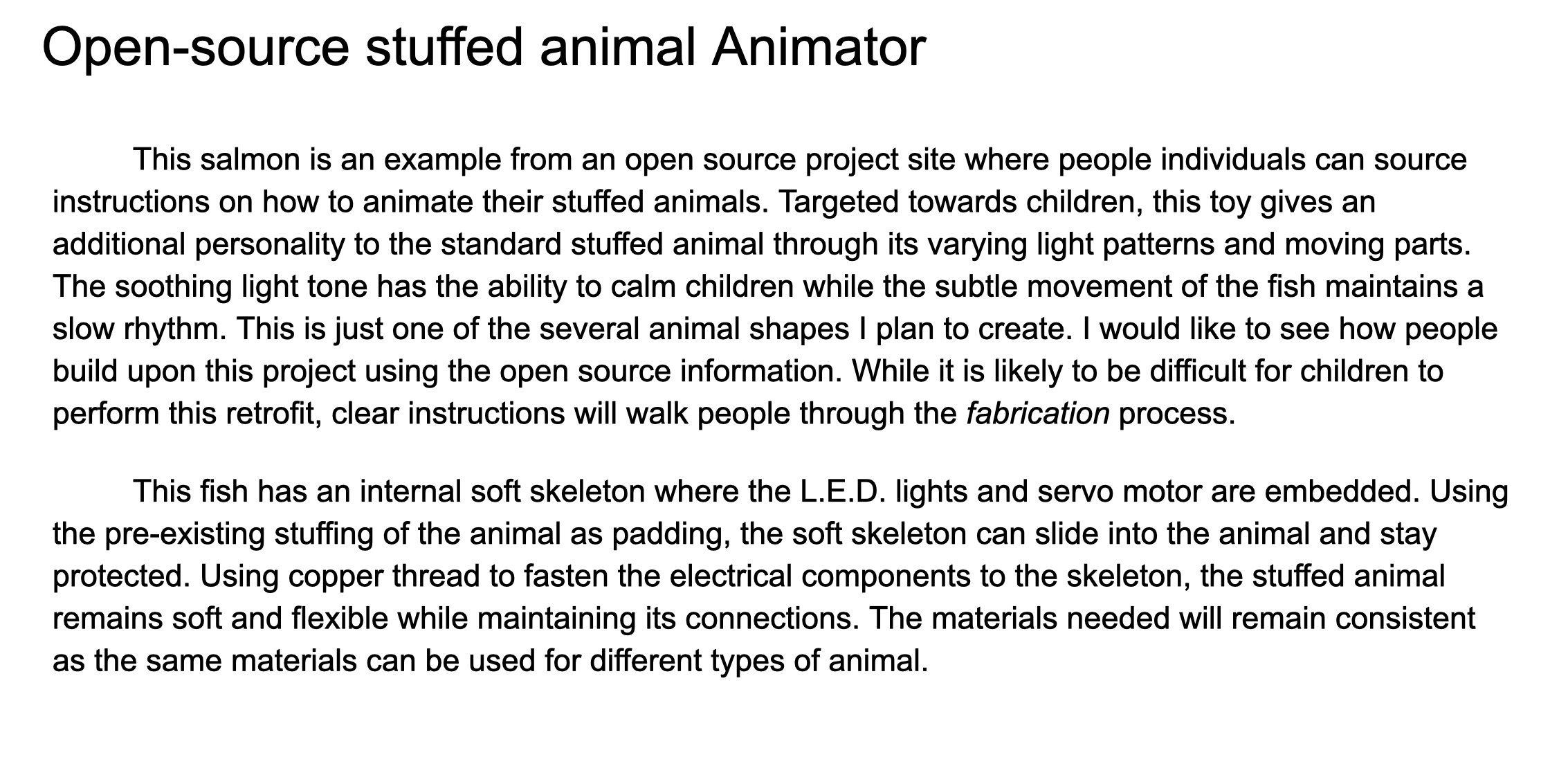 This salmon is an example from an open source project site where people individuals can source instructions on how to animate their stuffed animals. Targeted towards children, this toy gives an additional personality to the standard stuffed animal through its varying light patterns and moving parts. The soothing light tone has the ability to calm children while the subtle movement of the fish maintains a slow rhythm. This is just one of the several animal shapes I plan to create. I would like to see how people build upon this project using the open source information. While it is likely to be difficult for children to perform this retrofit, clear instructions will walk people through the fabrication process.